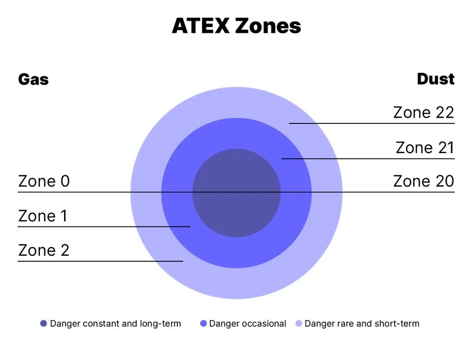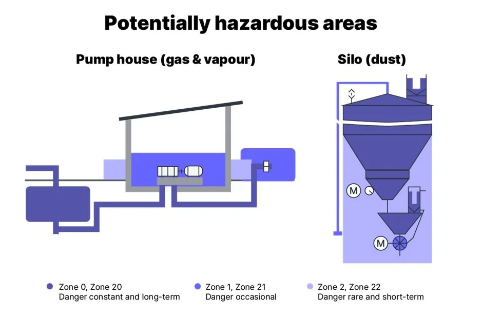 Potentially explosive atmospheres are divided into zones to account for different levels of risk as illustrated in figure 1 below. This classification allows explosion protection measures to be tailored for both safety engineering and economic efficiency.